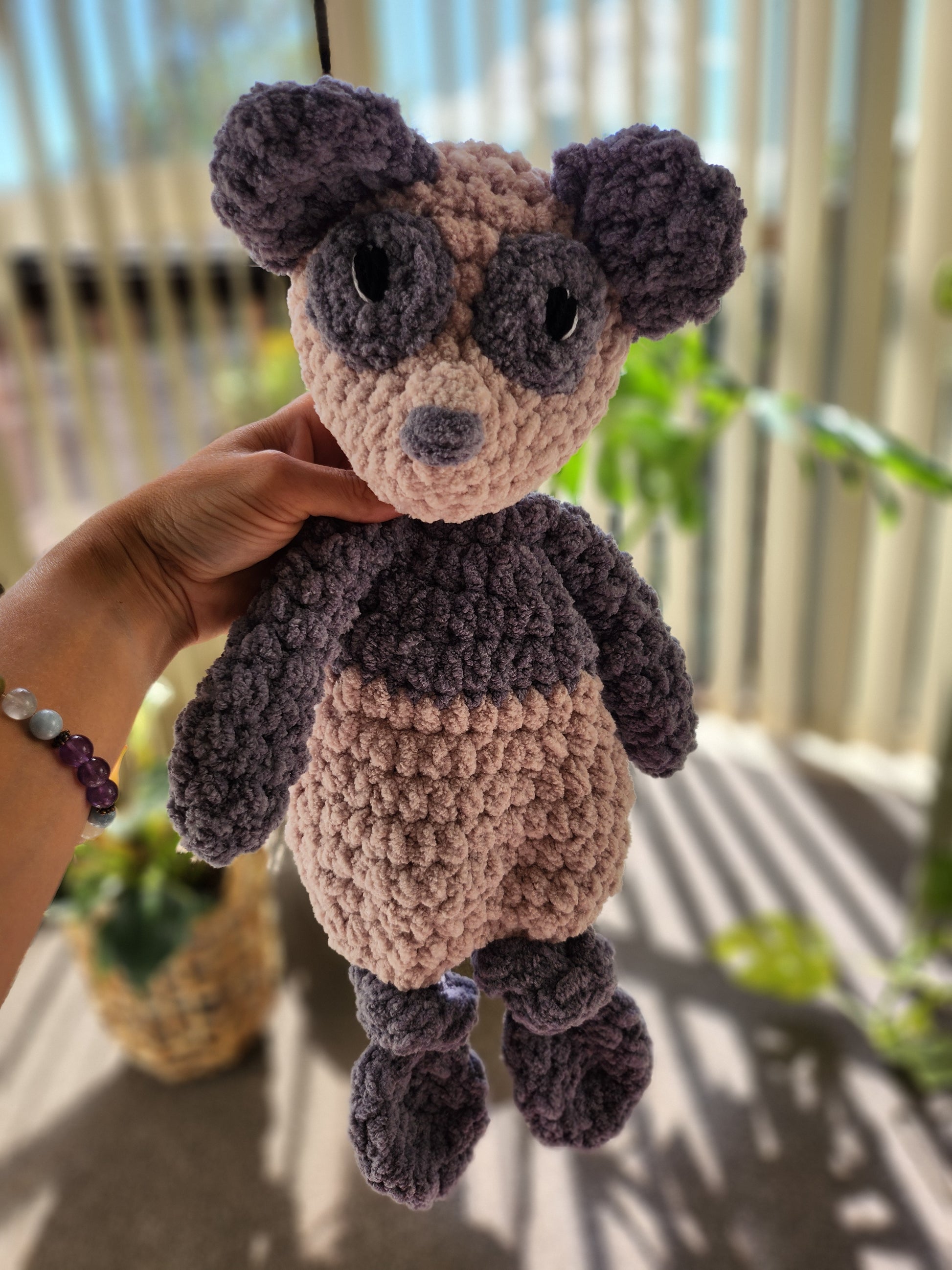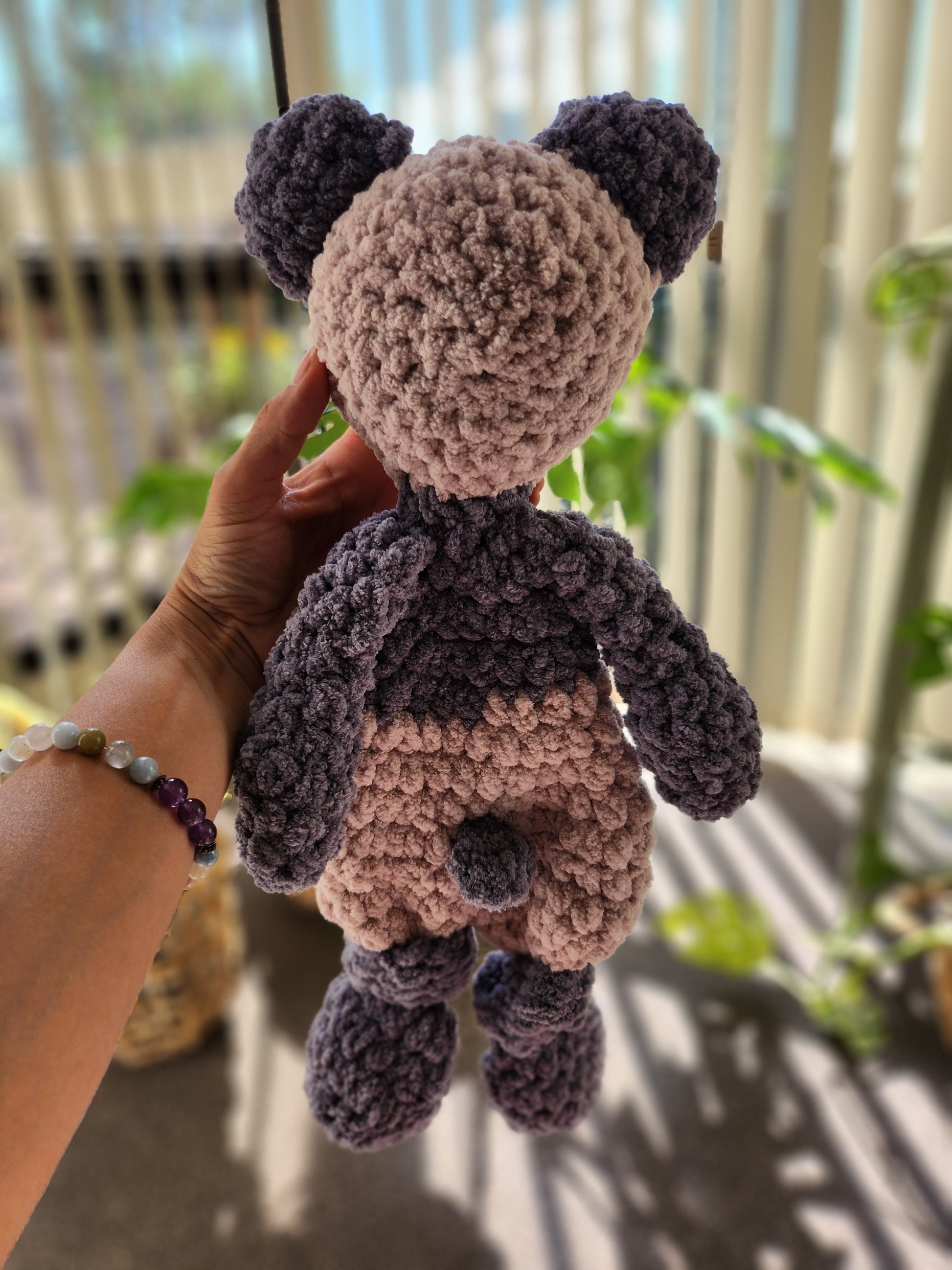 This Crochet Panda Snuggler is the ultimate cozy companion for your little one, combining softness, warmth, and a touch of playful charm. Crafted with care from premium, baby-safe yarn, the panda’s plush body is perfect for snuggling, providing a comforting feel during nap time or play. Featuring adorable embroidered details, including its sweet grey and light tan face and cute little ears, this cuddly panda will quickly become your child's favorite friend. Its lightweight design makes it easy to carry anywhere, and its soothing texture helps bring comfort and joy. A perfect gift or keepsake for babies and toddlers.
